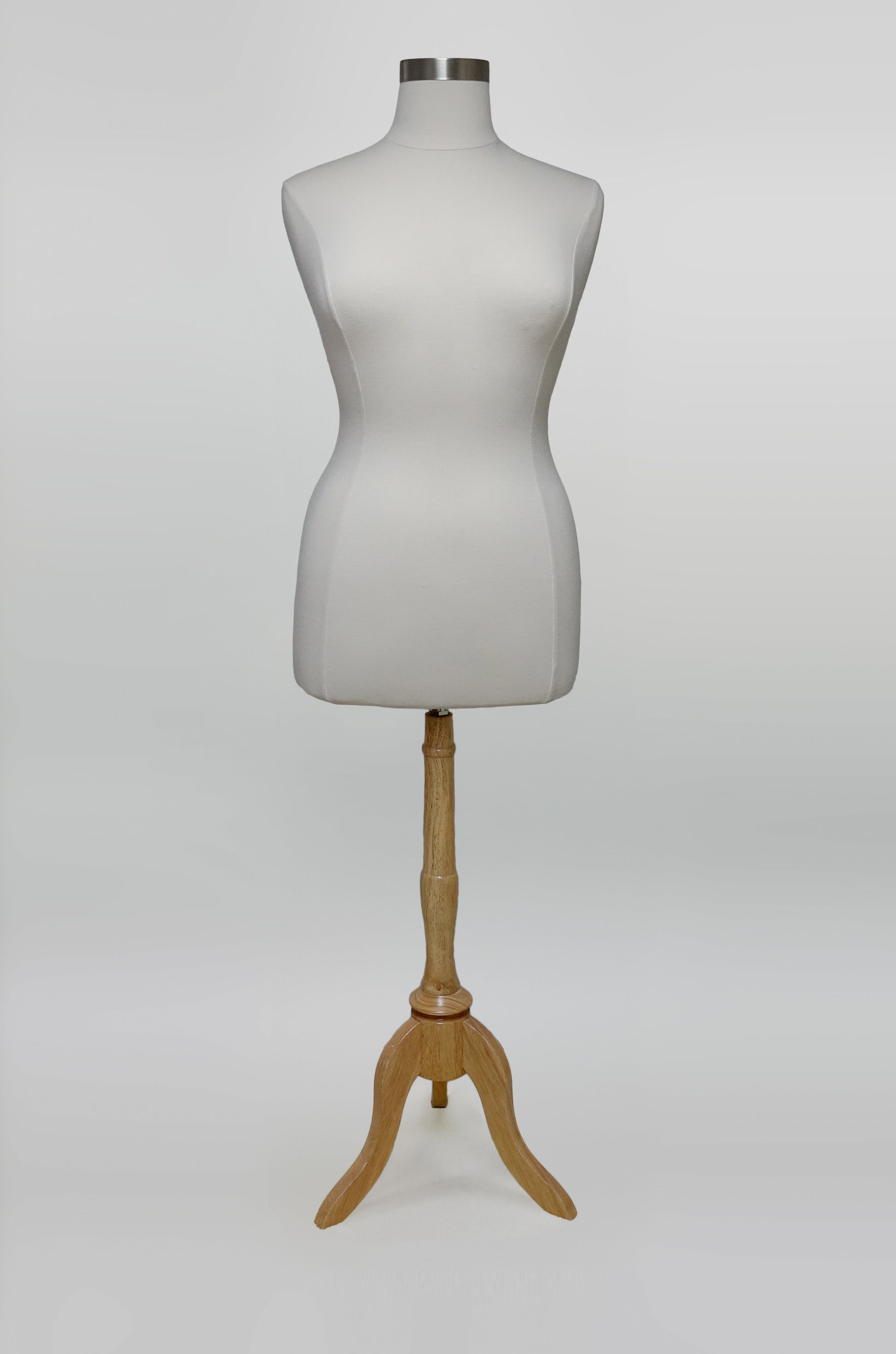 The dress form body is from the neck to the hips, and is covered in a knit fabric. You have two options of wooden bases, or a metal base which is ideal for heavier clothing such as wedding gowns. The height of the dress form is adjustable. Our plus size form only comes in cream.
